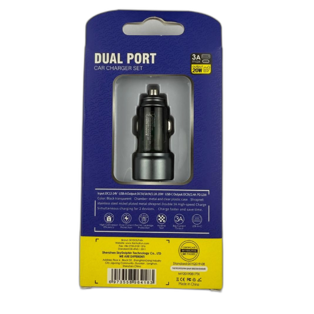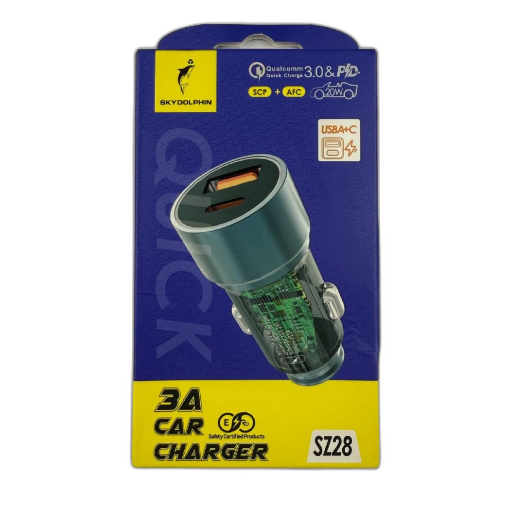 شارژر فندکی Sky Dolphin SZ28 با طراحی جمعوجور، دو پورت خروجی USB و Type-C و قابلیت فست شارژ، برای شارژ سریع انواع گوشی و تبلت در خودرو طراحی شده است.